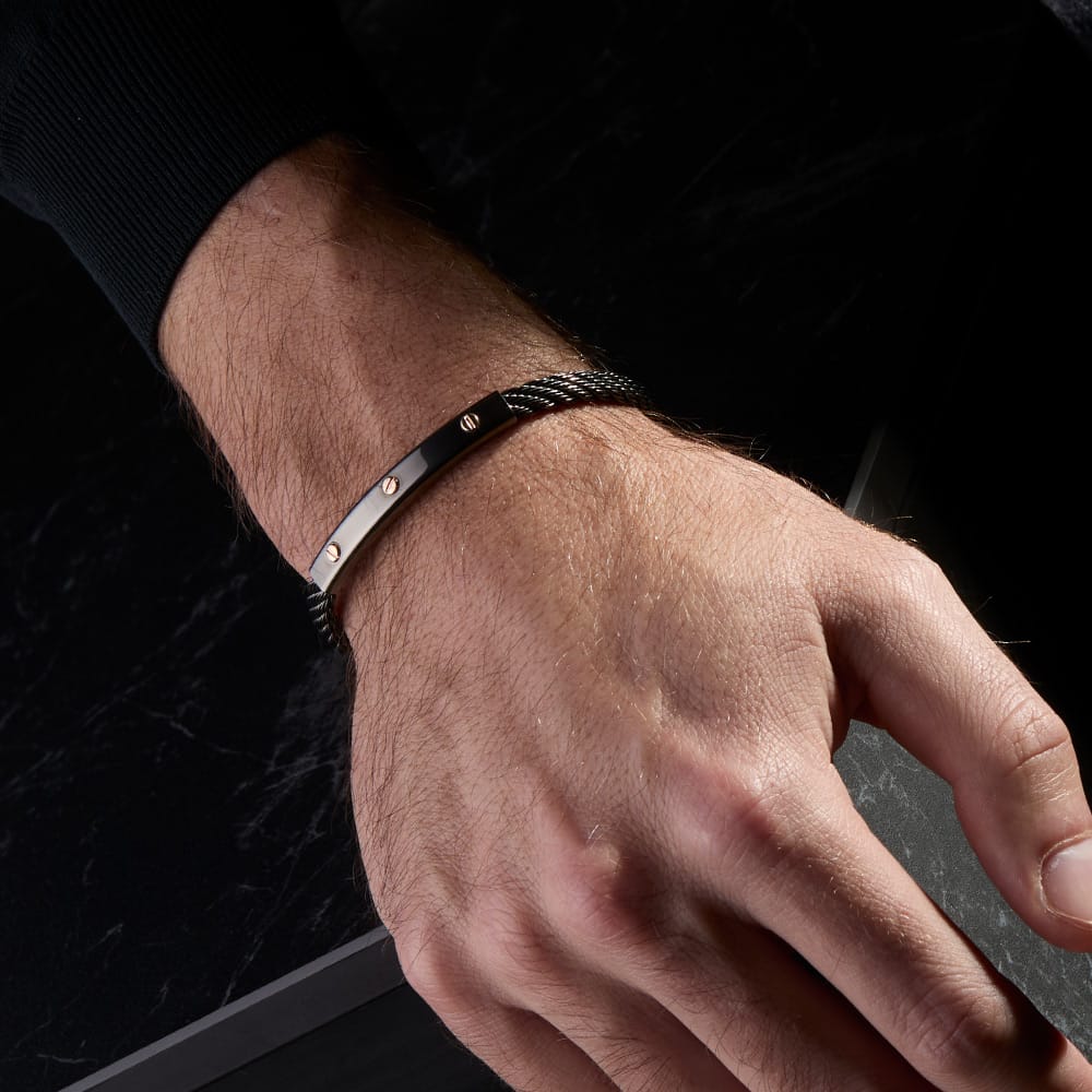 Bracciale in acciaio PVD nero inox 316L con chiusura a 3 posizioni e vitI in oro rosè 18kt. Misura standard 19 cm primo foro (allungabile 20 cm e 21 cm).