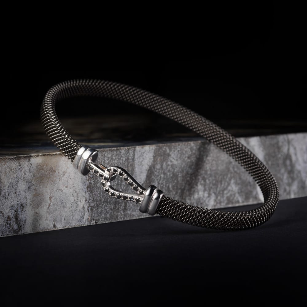 Bracciale con cinturino in acciaio PVD nero. Chiusura placcato rutenio 18kt gr.3.80 e diamanti neri ct.0.23.