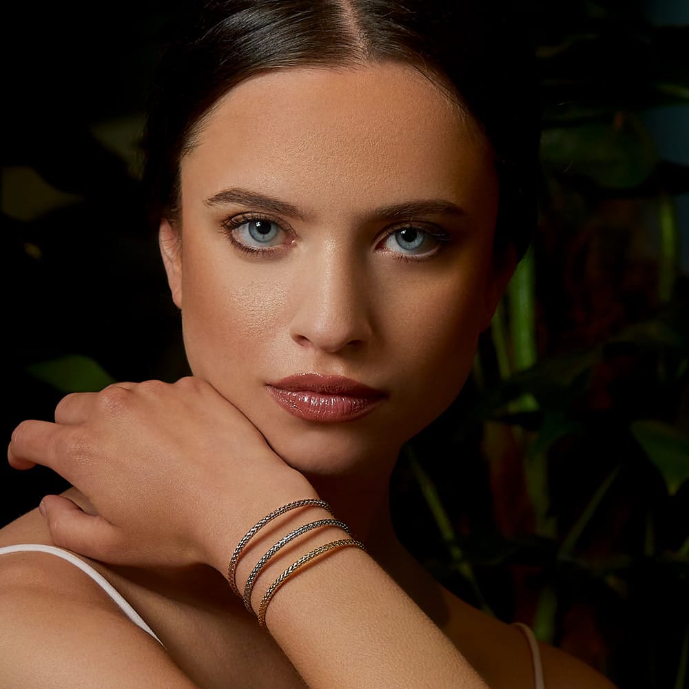 Bracciale 3mm in argento 925 placcato oro rosè con esclusiva lavorazione ad intreccio e chiusura a scatto.