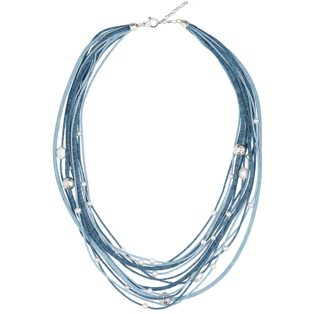 Collana scalare realizzata in filato di rame metallico smaltato con sfumature blu, impreziosito da boule in argento 925 rodiato e perle bianche d’acqua dolce. Chiusura a moschettone in argento rodiato.