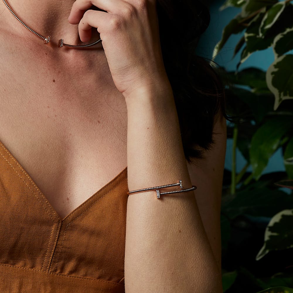 Bracciale contrariè realizzato con l’elegante lavorazione a spirale denominata “avvolto” in argento 925 placcato oro rosè impreziosito da elementi a forma di cerchio e zirconi.