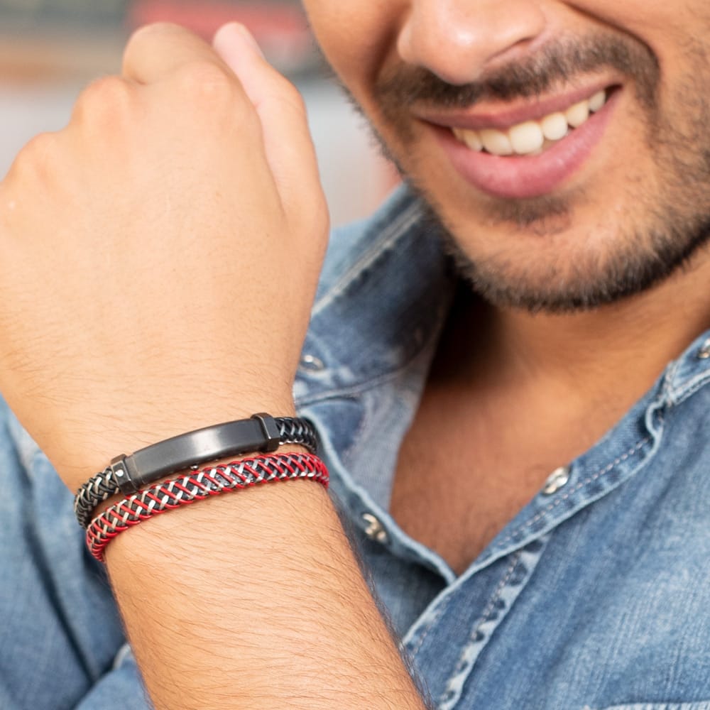 Bracciale intrecciato in pelle rossa/nera e acciaio con chiusura in acciaio PVD nero inox 316L satinato e diamante naturale. Misura standard 19 cm primo foro (allungabile 20 cm e 21 cm).