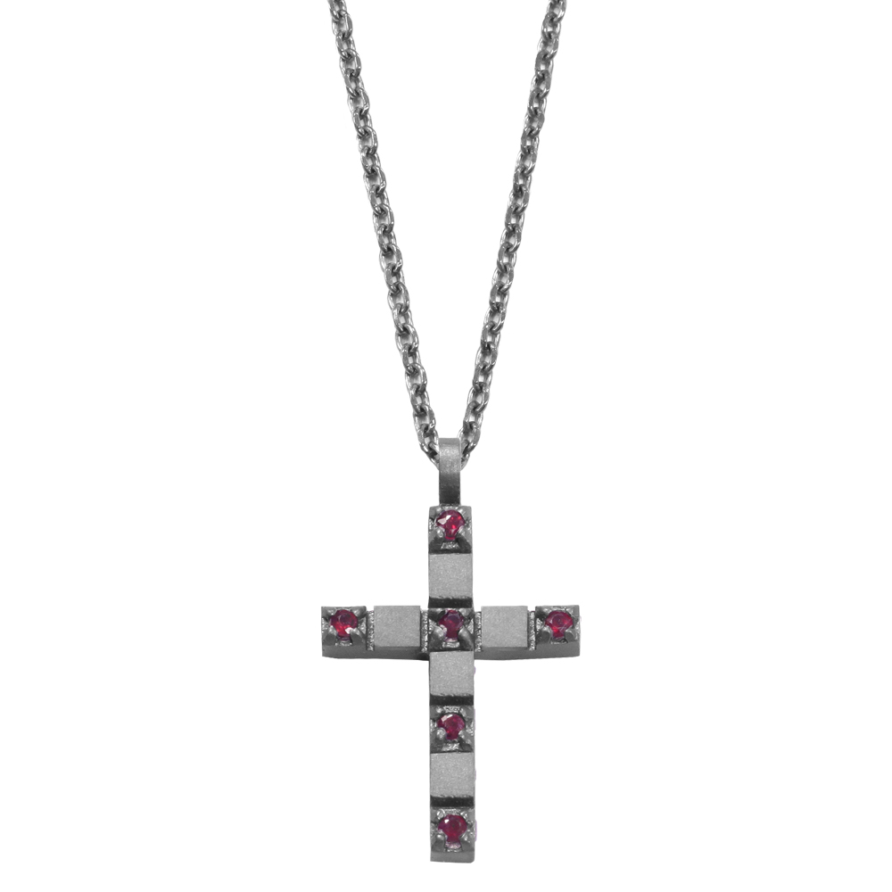 Croce in titanio impreziosita da rubini ct 0.18. Catena con moschettone in titanio. Misura 50+5cm di allungo.