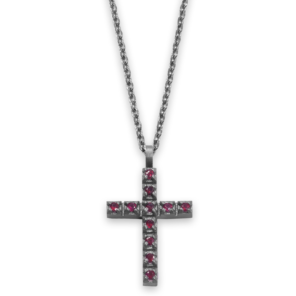Croce in titanio impreziosita da rubini ct 0.33. Catena con moschettone in titanio. Misura 50+5cm di allungo.