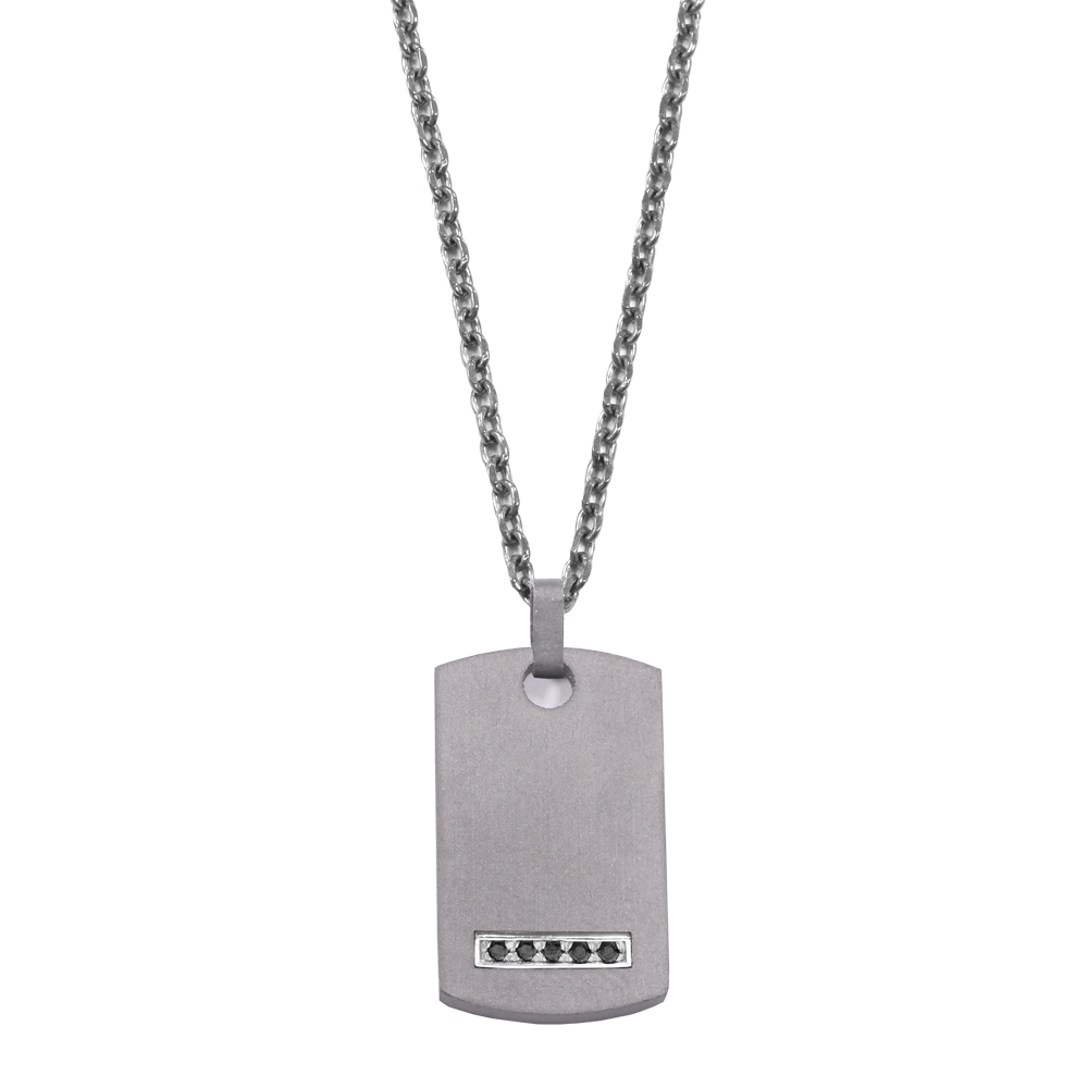 Piastra in titanio con elemento in oro bianco rodiato 18 kt gr 0.40 e diamanti neri ct 0.06. Catena con moschettone in titanio. Misura: 50+5cm di allungo.