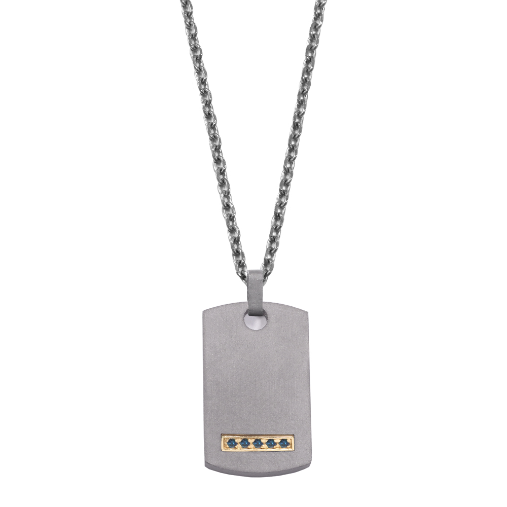 Piastra in titanio con elemento in oro giallo 18 kt gr 0.40 e zaffiri blu ct 0.06. Catena con moschettone in titanio. Misura: 50+5cm di allungo.